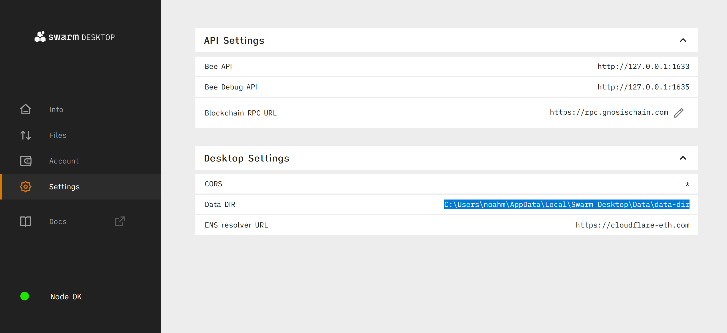 To restore from backup, begin with a new install of Swarm Desktop. Once the installation process is finished, navigate to the Settings tab in the app and copy the install file directory as indicated in the Data DIR field: