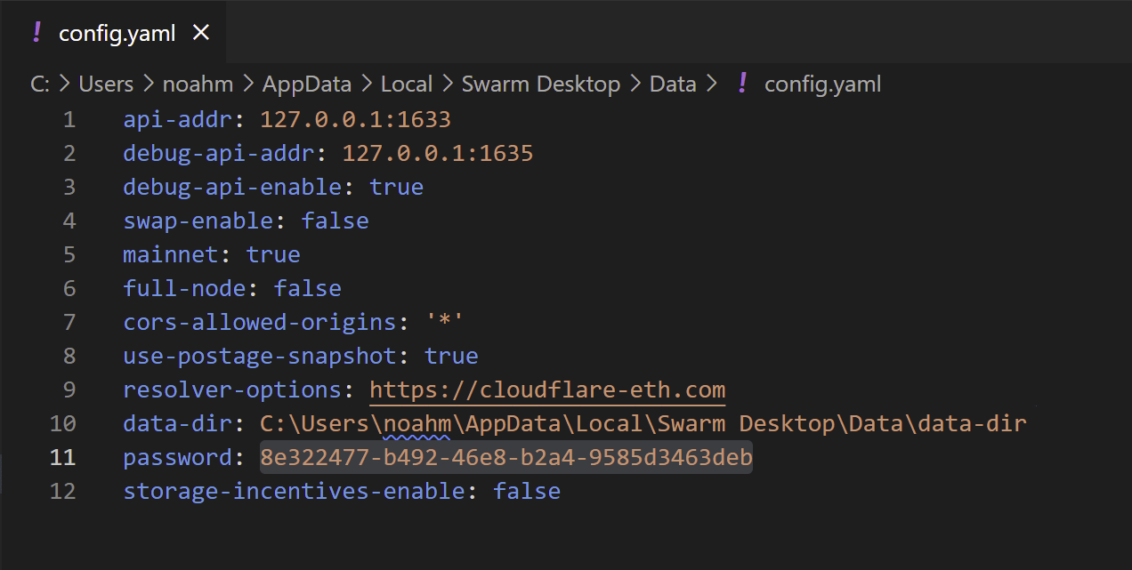 Alternatively if you have saved just the password and not the entire config file, open the default config.yaml file in a text editor such as VS Code or a plain text editor: